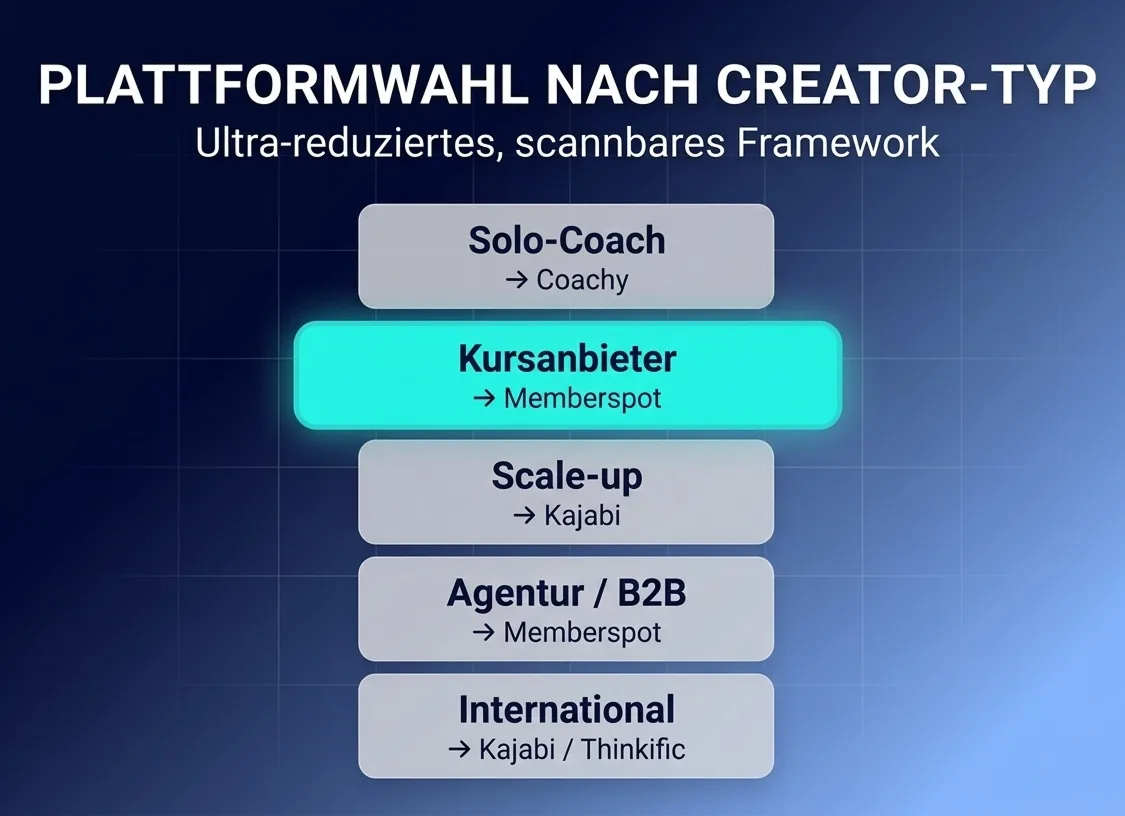 Für die meisten Creator im DACH-Markt ist das Minimum Viable Stack: eine SaaS-Kursplattform (Memberspot oder Coachy) + ein E-Mail-Tool. Alles andere ist Optimierung — nicht Grundlage.